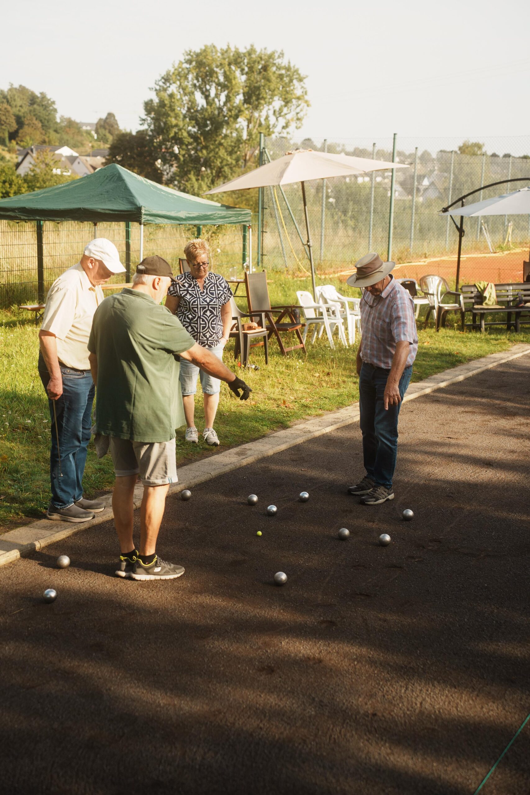 Bei 10 Teilnehmerinnen und Teilnehmern konnten diesmal alle 5 Durchgänge ohne Zeitbegrenzung bis zum 13. Punkt gespielt werden. Je Durchgang mussten auf 2 Bahnen jeweils Doubletten (2er-Teams) gegeneinander spielen. Auf der 3. Bahn spielten 2 Einzelspieler/Einzelspielerinnen gegeneinander. Nach jeder Runde wurden neue Spielpaarungen gelost. Niemand sollte zweimal im gleichen Team oder gegen den gleichen Gegner im nächsten Durchgang spielen. Ein vorheriger Gewinner bekam immer einen vorherigen Verlierer zugelost. Das führte zu sehr abwechslungsreichen und meist spannenden Partien. Nach 3 Durchgängen wurde vor dem Tennishaus die wohlverdiente und gut organisierte Essenspause eingelegt.
